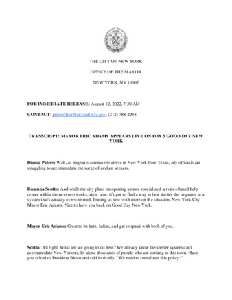 A transcript about New York City Mayor Eric Adams appearing live on FOX 5's Good Day New York to discuss the assistance towards migrants.