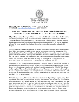 TRANSCRIPT: MAYOR ERIC ADAMS ANNOUNCES FIRST-IN-NATION STREET DELIVERISTAS HUBS TO SERVE NYC’S FOOD DELIVERY WORKERS