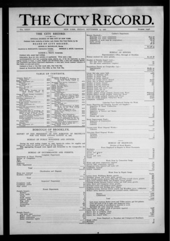 The City Record newspaper publishes notices which includes but is not limited to: public hearings and meetings, public auctions and sales, solicitations and awards and official rules proposed and adopted by city agencies. This is the City Record Newspaper for September 13, 1907.