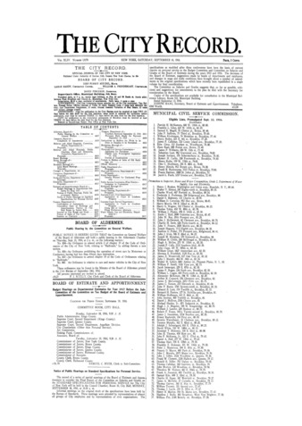 The City Record newspaper publishes notices which includes but is not limited to: public hearings and meetings, public auctions and sales, solicitations and awards and official rules proposed and adopted by city agencies. This is the City Record Newspaper for September 16, 1916.