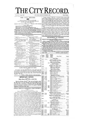 The City Record newspaper publishes notices which includes but is not limited to: public hearings and meetings, public auctions and sales, solicitations and awards and official rules proposed and adopted by city agencies. This is the City Record Newspaper for November 04, 1918.