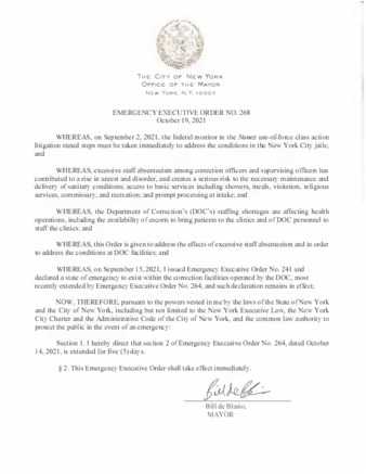The Mayor of New York City Proclaims a State of Emergency is declared to exist within the correction facilities operated by the DOC.