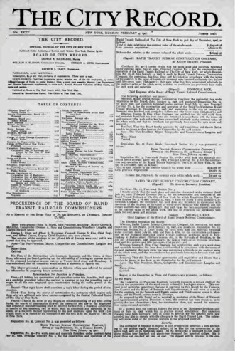The City Record newspaper publishes notices which includes but is not limited to: public hearings and meetings, public auctions and sales, solicitations and awards and official rules proposed and adopted by city agencies. This is the City Record Newspaper for February 04, 1907.
