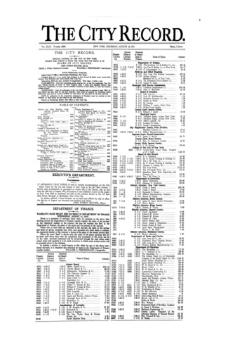 The City Record newspaper publishes notices which includes but is not limited to: public hearings and meetings, public auctions and sales, solicitations and awards and official rules proposed and adopted by city agencies. This is the City Record Newspaper for August 12, 1915.