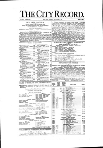 The City Record newspaper publishes notices which includes but is not limited to: public hearings and meetings, public auctions and sales, solicitations and awards and official rules proposed and adopted by city agencies. This is the City Record Newspaper for September 04, 1917.