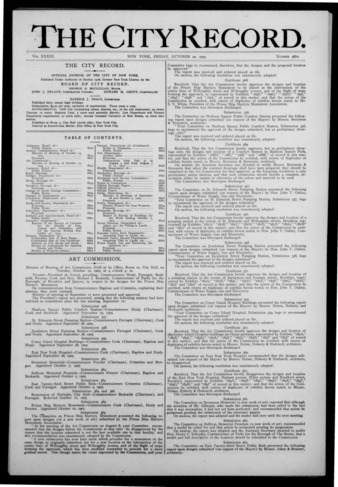 The City Record newspaper publishes notices which includes but is not limited to: public hearings and meetings, public auctions and sales, solicitations and awards and official rules proposed and adopted by city agencies. This is the City Record Newspaper for October 20, 1905.