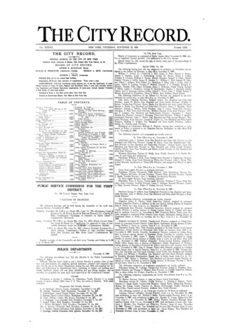 The City Record newspaper publishes notices which includes but is not limited to: public hearings and meetings, public auctions and sales, solicitations and awards and official rules proposed and adopted by city agencies. This is the City Record Newspaper for November 18, 1909.