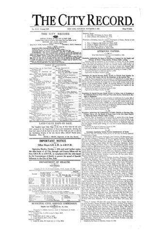 The City Record newspaper publishes notices which includes but is not limited to: public hearings and meetings, public auctions and sales, solicitations and awards and official rules proposed and adopted by city agencies. This is the City Record Newspaper for November 02, 1918.