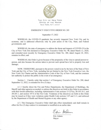 Emergency Executive Order No. 205, extends Emergency Executive Order No. 200, dated September 12, 2022, for five (5) days, if this relates to COVID-19 pandemic.