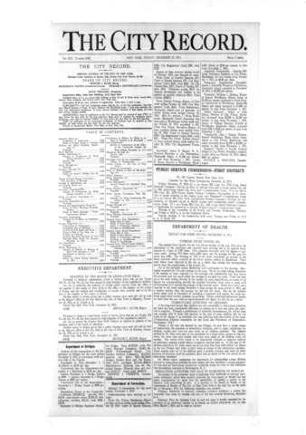 The City Record newspaper publishes notices which includes but is not limited to: public hearings and meetings, public auctions and sales, solicitations and awards and official rules proposed and adopted by city agencies. This is the City Record Newspaper for December 19, 1913.