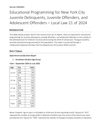 In compliance with Local Law 21 of 2024, NYCPS in collaboration with ACS produces a report on educational programming for juvenile delinquents, juvenile offenders, and adolescent offenders in ACS juvenile detention.