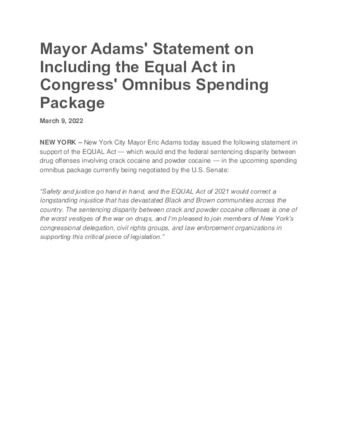 New York City Mayor Eric Adams issues a statement in support of the EQUAL Act, ending the federal sentencing disparity between drug offenses involving crack cocaine and powder cocaine.