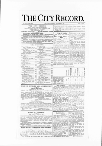 The City Record newspaper publishes notices which includes but is not limited to: public hearings and meetings, public auctions and sales, solicitations and awards and official rules proposed and adopted by city agencies. This is the City Record Newspaper for November 19, 1914.