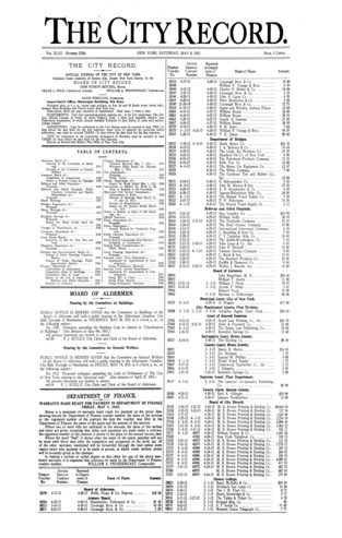 The City Record newspaper publishes notices which includes but is not limited to: public hearings and meetings, public auctions and sales, solicitations and awards and official rules proposed and adopted by city agencies. This is the City Record Newspaper for May 08, 1915.