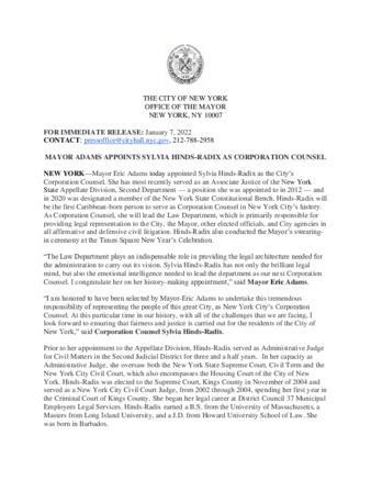 MAYOR ADAMS APPOINTS SYLVIA HINDS-RADIX AS CORPORATION COUNSEL
