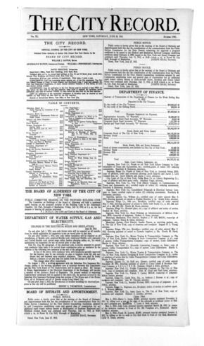 The City Record newspaper publishes notices which includes but is not limited to: public hearings and meetings, public auctions and sales, solicitations and awards and official rules proposed and adopted by city agencies. This is the City Record Newspaper for June 29, 1912 with supplement.