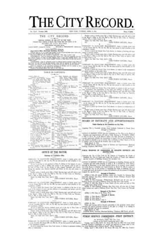 The City Record newspaper publishes notices which includes but is not limited to: public hearings and meetings, public auctions and sales, solicitations and awards and official rules proposed and adopted by city agencies. This is the City Record Newspaper for April 04, 1916.
