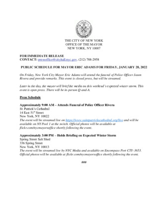 PUBLIC SCHEDULE FOR MAYOR ERIC ADAMS FOR FRIDAY, JANUARY 28, 2022