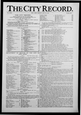 The City Record newspaper publishes notices which includes but is not limited to: public hearings and meetings, public auctions and sales, solicitations and awards and official rules proposed and adopted by city agencies. This is the City Record Newspaper for July 27, 1903.