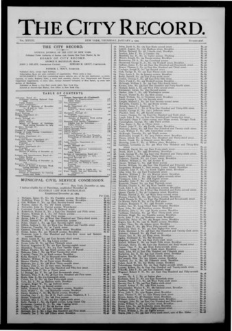 The City Record newspaper publishes notices which includes but is not limited to: public hearings and meetings, public auctions and sales, solicitations and awards and official rules proposed and adopted by city agencies. This is the City Record Newspaper for January 05, 1905.