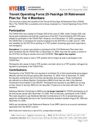 This brochure outlines the benefits of the Transit 25-Year/Age 55 Retirement Plan (T25/55 Plan) for Tier 4 Members. The T25/55 Plan is available only to those employed in a Transit Operating Force (TOF) position.
