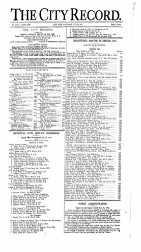 The City Record newspaper publishes notices which includes but is not limited to: public hearings and meetings, public auctions and sales, solicitations and awards and official rules proposed and adopted by city agencies. This is the City Record Newspaper for July 24, 1915.