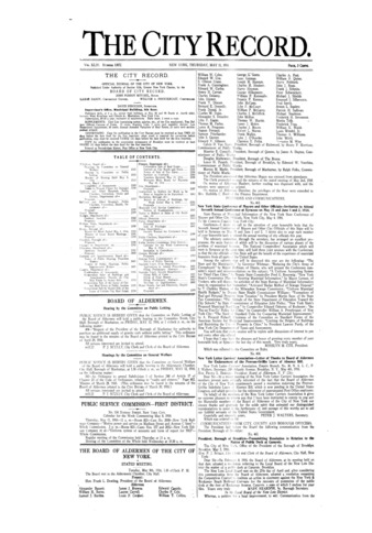 The City Record newspaper publishes notices which includes but is not limited to: public hearings and meetings, public auctions and sales, solicitations and awards and official rules proposed and adopted by city agencies. This is the City Record Newspaper for May 11, 1916.