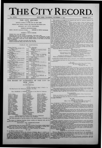 The City Record newspaper publishes notices which includes but is not limited to: public hearings and meetings, public auctions and sales, solicitations and awards and official rules proposed and adopted by city agencies. This is the City Record Newspaper for December 08, 1904.