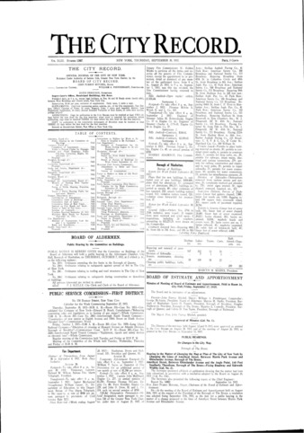 The City Record newspaper publishes notices which includes but is not limited to: public hearings and meetings, public auctions and sales, solicitations and awards and official rules proposed and adopted by city agencies. This is the City Record Newspaper for September 30, 1915.