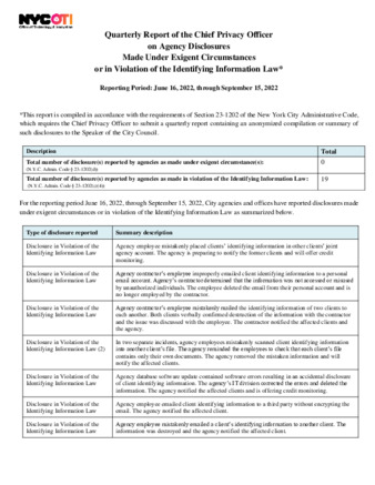 Section 23-1202 of the New York City Ad. Code requires the Chief Privacy Officer to submit a quarterly report containing an anonymized summary of certain disclosures of identifying information made by City agencies under exigent circumstances or in violation of Local Laws 245 and 247 of 2018.