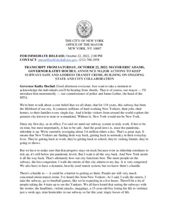 TRANSCRIPT: MAYOR ERIC ADAMS, GOVERNOR KATHY HOCHUL ANNOUNCE MAJOR ACTIONS TO KEEP SUBWAYS SAFE AND ADDRESS TRANSIT CRIME