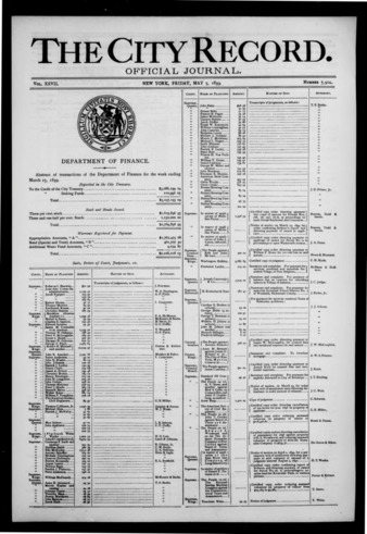 The City Record newspaper publishes notices which includes but is not limited to: public hearings and meetings, public auctions and sales, solicitations and awards and official rules proposed and adopted by city agencies. This is the City Record Newspaper for May 05, 1899.
