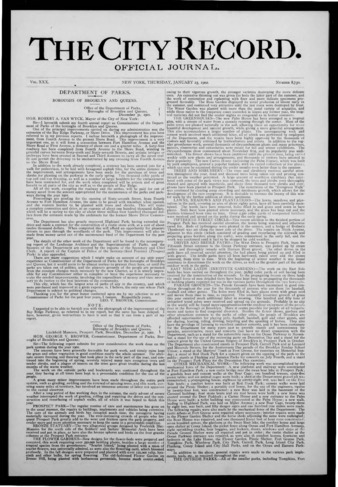 The City Record newspaper publishes notices which includes but is not limited to: public hearings and meetings, public auctions and sales, solicitations and awards and official rules proposed and adopted by city agencies. This is the City Record Newspaper for January 23, 1902.