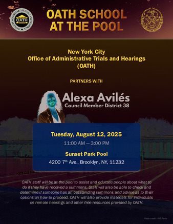 OATH staff were at the pool to assist and educate people about what to do should they have received a summons and to check to determine if someone has an outstanding summons. Materials about remote hearings and other free resources were provided to the public as well.