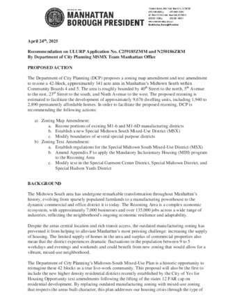 Recommendation on ULURP Application No. C259185ZMM and N250186ZRM By Department of City Planning MSMX Team Manhattan Office