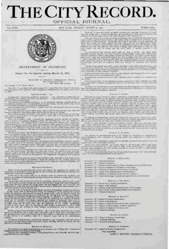 The City Record newspaper publishes notices which includes but is not limited to: public hearings and meetings, public auctions and sales, solicitations and awards and official rules proposed and adopted by city agencies. This is the City Record Newspaper for August 06, 1901.