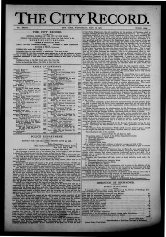 The City Record newspaper publishes notices which includes but is not limited to: public hearings and meetings, public auctions and sales, solicitations and awards and official rules proposed and adopted by city agencies. This is the City Record Newspaper for July 18, 1906.