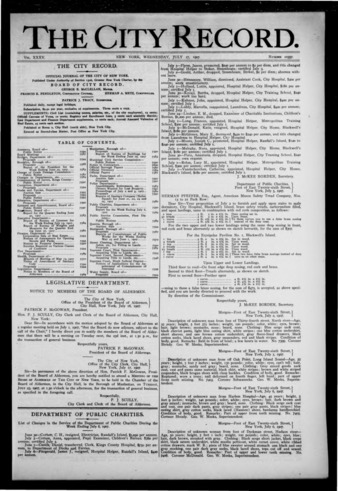 The City Record newspaper publishes notices which includes but is not limited to: public hearings and meetings, public auctions and sales, solicitations and awards and official rules proposed and adopted by city agencies. This is the City Record Newspaper for July 17, 1907.