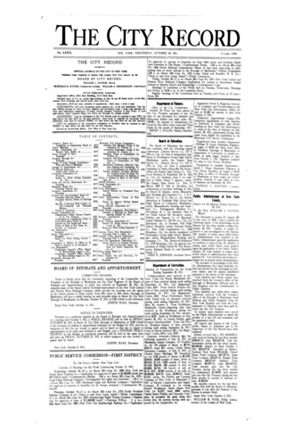 The City Record newspaper publishes notices which includes but is not limited to: public hearings and meetings, public auctions and sales, solicitations and awards and official rules proposed and adopted by city agencies. This is the City Record Newspaper for October 18, 1911.