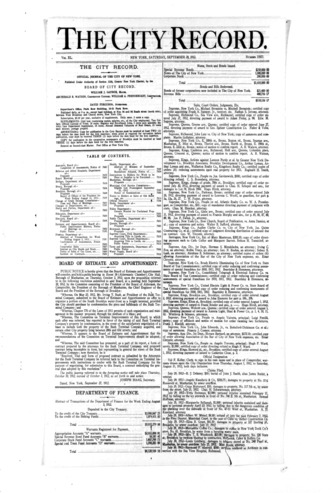 The City Record newspaper publishes notices which includes but is not limited to: public hearings and meetings, public auctions and sales, solicitations and awards and official rules proposed and adopted by city agencies. This is the City Record Newspaper for September 28, 1912.