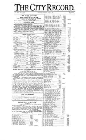 The City Record newspaper publishes notices which includes but is not limited to: public hearings and meetings, public auctions and sales, solicitations and awards and official rules proposed and adopted by city agencies. This is the City Record Newspaper for July 14, 1914.