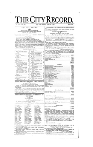 The City Record newspaper publishes notices which includes but is not limited to: public hearings and meetings, public auctions and sales, solicitations and awards and official rules proposed and adopted by city agencies. This is the City Record Newspaper for February 28, 1918 with supplement.