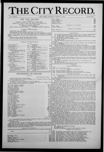 The City Record newspaper publishes notices which includes but is not limited to: public hearings and meetings, public auctions and sales, solicitations and awards and official rules proposed and adopted by city agencies. This is the City Record Newspaper for August 12, 1905.