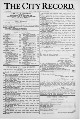 The City Record newspaper publishes notices which includes but is not limited to: public hearings and meetings, public auctions and sales, solicitations and awards and official rules proposed and adopted by city agencies. This is the City Record Newspaper for April 10, 1908.