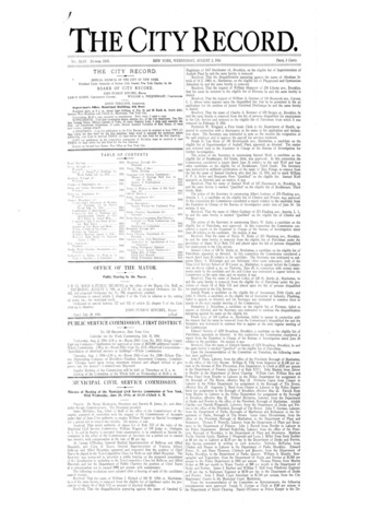 The City Record newspaper publishes notices which includes but is not limited to: public hearings and meetings, public auctions and sales, solicitations and awards and official rules proposed and adopted by city agencies. This is the City Record Newspaper for August 02, 1916.