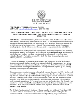 Press Release: DE BLASIO ADMINISTRATION, NYPD ANNOUNCE ALL OFFICERS ON PATROL TO WEAR BODY CAMERAS BY END OF 2018, ONE YEAR EARLIER THAN EXPECTED