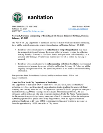 The New York City Department of Sanitation announced that in observance Lincoln’s Birthday, there will be no trash, composting or recycling collection on Monday, February 13, 2023.