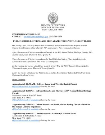 PUBLIC SCHEDULE FOR MAYOR ERIC ADAMS FOR SUNDAY, AUGUST 21, 2022