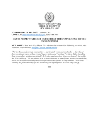 MAYOR ADAMS’ STATEMENT ON PRESIDENT BIDEN’S MARIJUANA REFORM ANNOUNCEMENT