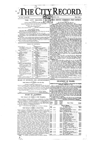 The City Record newspaper publishes notices which includes but is not limited to: public hearings and meetings, public auctions and sales, solicitations and awards and official rules proposed and adopted by city agencies. This is the City Record Newspaper for March 01, 1915.